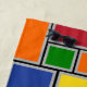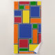 Dieses Strandtuch hat ein Bauhaus-Design von Rechtecken, die mit grauen Linien gebildet und mit rot, gelb, orange, blau und grün auf einem Feld von schwarz gefüllt.