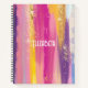 Ein personalisiertes Spiralnotebook mit abstraktem Hintergrund. Lebhafte Streifen in fett- und pastellfarbenen Farben. Pinks, Blues, Pfefferminzen und Gelbtöne kombiniert mit Imitaten funkelnd Glitzer in Gold überlagert.