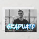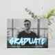 Trendy Abschluss Ankündigung mit dem horizontalen Foto des Absolventen mit "Graduate" in blau 90er Jahre-Stil Schrift dargestellt. Personalisieren Sie die Front der kühnen Graduierungsankündigungen, indem Sie den Namen, die Schule und den Abschluss des Absolventen Jahr. Die Rückseite der Ankündigung weist ein blaues Farbverlauf konfetti Muster auf.
