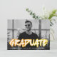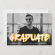 Trendy Abschluss Ankündigung mit dem waagerechten Foto des Absolventen mit "Graduate" in orange und gelb 90er Jahren Schrift dargestellt. Personalisieren Sie die Front der kühnen Graduierungsankündigungen, indem Sie den Namen, die Schule und den Abschluss des Absolventen Jahr. Die Rückseite der Ankündigung weist ein Farbverlauf konfetti Muster in orange und gelb.