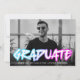 Trendy Abschluss Ankündigung mit dem horizontalen Foto des Absolventen mit "Graduate" in farbigen 90er-Jahre-Stil Schrift dargestellt. Personalisieren Sie die Front der kühnen Graduierungsankündigungen, indem Sie den Namen, die Schule und den Abschluss des Absolventen Jahr. Die Rückseite der Ankündigung weist ein konfetti Gefälle Muster in blau, türkis, lila und magenta Farben.