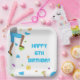 Rock On! Die Kletterwand mit farbenfrohen Laderäumen ist in lustiger Aquarelltextur. Im Text steht "Rock On" mit Platz für das Geburtstagsmädchen oder die Nachricht des Jungen unten. Perfekte Teller für eine Geburtstagsparty zum Thema Klettern/