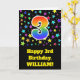Die Vorderseite dieses spannenden, lustigen und lebendigen Geburtstagskarten-Designs zeigt ein farbenfrohes Muster von Sternen-Formen, zusammen mit der Zahl "3" mit einem farbigen Regenbogenspektrum wie Farbverlaufsmuster auf schwarzem Hintergrund. Auf der Vorderseite befindet sich auch eine Geburtstagsgrüßbotschaft mit einem personalisierten Empfängernamen. Im Inneren befindet sich eine individuell anpassbare Geburtstags-Grußnachricht, oder vielleicht kann gelöscht und links werden, wenn eine Nachricht von Hand geschrieben werden soll. Eine individuell anpassbare Geburtstagskarte wie diese könnte eine lustige Art sein, jemandes dritten Geburtstag zu bestätigen. [~Z0000348]