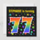 Dieses lustige, aufregende und lebendige Geburtstagsfeier-Einladungs-Design zeichnet sich durch ein farbenprächtiges Sternmuster aus, zusammen mit der Zahl "77" mit einem bunten Regenbogen-ähnlichen Spektrum oder Gradientenmuster. Der Name auf der Vorderseite kann personalisiert sein. Auf der Rückseite finden Sie benutzerdefinierte Informationen zum Party. Geburtstagsfeierlichkeiten wie diese werden potenziellen Gästen zu einer Geburtstagsparty geschickt, die zum siebzigsten Geburtstag von jemandem gefeiert wird. [~Z0000349]