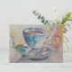 Eine hübsche, elegante Tasse und Untertasse in blauen Farbtönen auf einem Aquarell in Rosa-, Blau- und Ockertönen.
