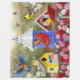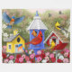 Eine wunderschön bemalte Szene mit einer Vielzahl von Singvögeln und farbenfrohen Vogelhäusern in einem Garten blüht mit Dogwood und Kosmos-Blume. Rote, gelbe und blaue Vogelhäuser sind Zuhause zu den östlichen Bluebirds, den nördlichen roten Kardinälen und den amerikanischen Goldfinken.