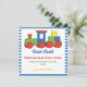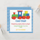 Farbenfrohe Bahn Kindergeburtstag Platz Einladung. Dieses niedliche und lustige Design verfügt über einen Zug in Rot, Grün, Blau, Gelb und einen Rahmen mit blauen, weißen horizontalen Streifen. Auf der Rückseite ist ein blaues, weiß gestreiftes Muster. Einige Elemente von Trina Clark