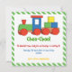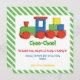 Farbenfrohe Bahn Kindergeburtstag Platz Einladung. Dieses niedliche und lustige Design verfügt über einen Zug in Rot, Grün, Blau, Gelb und einen Rahmen mit grünen, weißen diagonalen Streifen. Auf der Rückseite ist ein grünes, weiß gestreiftes Muster. Einige Elemente von Trina Clark