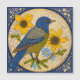 Farbige Abbildung eines Vogels auf einem Ast, umgeben von gelben Blumen und blauen Gängen. Das Kunstwerk zeichnet sich durch ein gepunktetes Muster und eine harmonische Mischung aus Blau, Gelb und Erdtönen aus und schafft so eine fröhliche und lebendige Komposition.