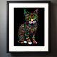 Farbenfrohe Zeichn einer Katze auf schwarzem Hintergrund. Das Seitenverhältnis beträgt 5:4. Es wurde entworfen, um als 5"×4", 10 "x8", 20"×16", 30 "x24" gedruckt zu werden