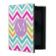Modernes iPad Gehäuse in fröhlichem, hellrosa, lavender, grün, aqua, gelb und weiß Zickzack Zickzackmuster. Eine runde, farbige Scheibe aus Lavendel, auf der Vorderseite, hat ein großes weißes Monogramm mit einem Buchstaben. Personalisieren Sie den Brief für sich selbst oder als eine süße Geschenkidee.