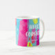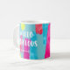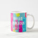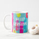 Diese lustige und trendige Tasse sagt "hallo herrlich" in weißem Text über einem türkisfarbenen, hellgelben, magenta und rot abstrakten Muster.