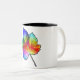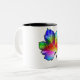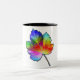 Ein lebendiges, mehrfarbiges Blatt ist Set vor weißem Hintergrund, das ein Spektrum von blau bis rot zeigt. Das Detail in den Adern des Blattes wird durch die kontrastierenden Farben verstärkt.