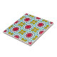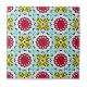 Lebhaftes Keramik-Fliesen-Design mit einem nahtlosen Muster aus geometrischen Formen in dunkelrot, gelb, schwarz, weiß und hellblau.