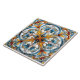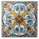 Eine atemberaubende Fliesenkomposition mit einem fesselnden Blumenmotiv harmonisiert die Farbtöne Blau, Gelb und Orange.