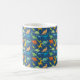 Farbiges Muster der Dinosaurier Silhouette. Tyrannosaurus Rex, Titanosaurier, Triceratop, Raptoren, Ankylosaurs, Dino-Birds, Stegosaurus, Apatosaurus, Pteranodon und mehr in einem farbenfrohen Muster in blauem Hintergrund, und Dinosaurier in Grün, Blau, Gelb und Orange.