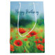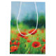 Eine fröhliche Geschenktasche für alle, die Blume Lieben. Eine farbenfrohe Landschaft mit einem Feld roter Pappchen in lebendiger Aquarell. Die kühnen Farben Rot, Grün und Blau erinnern an einen warmen Sommertag.