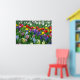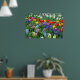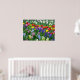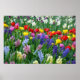 Poster mit bunten Frühlingsgartendruck. Schöne Narzissen, Tulpen und Hyazinthen.