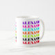 Diese niedliche Tasse zeichnet sich durch ein farbenfrohes personalisiertes Namensmuster in einem groben Retro-Schriftart aus. Der individuelle Name wiederholt sich in lila Rosa, Türkis, Orange, Hellgrün, Schwarz und Rot.