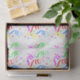 Farbiges Papier mit einer Grafik von blauen, roten, grünen, gelben und rosa Konfetti und Bändern. Anpassen, um Ihren eigenen Text hinzuzufügen.