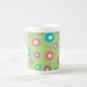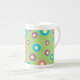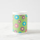 Farbige Blütenmuster auf der Tasse der Knochen-China im grünen Hintergrund.