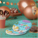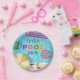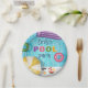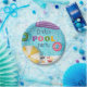 Desteis farbenfrohe Illustration einer blauen Sommer Schwimmbadszene. Im Schwimmbad gibt es eine lila Matratze, einen grünen Schwimmring und einen rosa Schwimmring. Auf der Unterseite des Designs befindet sich ein weißer Fliesenboden und auf ihm befinden sich einige Gegenstände. Es handelt sich um ein orangefarbenes Getränk mit Stroh, schwarzer Sonnenbrille, gelb-weiß gestreiftem Sonnenschirm und einem Obstteller. Zu den Früchten zählen eine Wassermelone-Scheibe, eine orangefarbene Scheibe und drei Erdbeeren. Die Vorderseite lautet: "Pool Party" in farbenfrohen Buchstaben über dem Pool Wasser. Über diesem Text befindet sich beispielsweise ein personalisierbarer Textbereich für den Namen des Hosts.