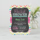 Brautduscheinladung mit niedlichem Kalkboard Schriftart auf rosa, aquamarin, grün, blau, orange und weiß Zickzack Streifen Muster. Vintage Fechtkreide-Schriftart auf coolem Hintergrund mit einem rassigen Gestaltungselement.