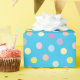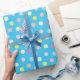 Hellblaue Geschenkpackung mit bunten Punkten.