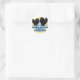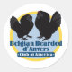 Dies ist die farbige Version des Logos, das ein Paar schwarz belgische d'Anvers auf blauem und gelbem Hintergrund zeigt.