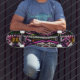 Kreativität in der Bearbeitung von Fotos, produziert diese brillante, Abstrakte Grafik, mit zufälligen, geometrischen Formen in mehrfarbigen Farbtönen von; rosa, blau, lila, grün, Limon-grün, rot, bronze, orange, grau, schwarz und weiß.