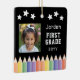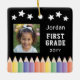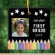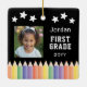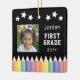 Dieses lebendige Design mit dem Foto Ihres Kindes, umgeben von spielerisch farbigen Stiften, beinhaltet seinen Namen, das Jahr und die Note für eine unterhaltsame, personalisierte Touch. Ein perfekter Sake, um sich an diese frühen Schultage zu erinnern und ein nachdenkliches Geschenk für Eltern und Großeltern. Feiern Sie Ihren kleinen Schüler mit unserem ersten Schulgang zurück zum farbenfrohen Foto Keepake Metal Ornament! Design von Ana Garza/Kardz Studio Designs. Das Vorlagenbild ist generativer Inhalt. Wenn Sie Fragen haben, kontaktieren Sie mich bitte über den Zazzle Chat.