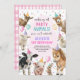 Diese Einladung zeigt hübsche, mädchenhafte Nutztiere, farbenfrohe Ballons in Rosa, lila und Türkis, und einen Konfetti-Sprinkl, der ein fröhliches und lebendiges Design schafft, das einen barnyard Bash wie kein anderer verspricht.