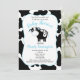 Diese lustige Farm Thema Kuh Einladung beinhaltet eine Milchkuh mit blauen Elementen, und eine schwarz-weiße Kuh Muster Rand mit solidem hellblau Rücken. Ideal für eine Baby Farm Babydusche!