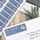 Farm ducks return address labels. Two white ducks decorate colonial blue color labels with white text. The first line is script for names or family name. The address space will hold two or three lines, as needed.