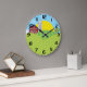 Keep track of time with a touch of rural charm using this sunny farmyard wall clock. The clock face features a delightful illustration of a red barn and a ripe apple orchard under a brilliant sun, making it a wonderful addition to a kitchen, nursery, or classroom. The bright primary colors and clear layout make it easy to read while adding a decorative element to your walls. This clock is a great way to bring the peaceful feeling of a morning on the farm into your home or office decor throughout the day.