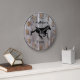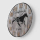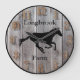 Die Uhr im Barnholzstil wird mit Ihrem Bauernhof, Ihrer Ranch oder dem Stallnamen personalisiert, um der Einrichtung eine persönliche Touch zu verleihen. Barnwood Look Uhr Gesicht mit galoppierender Silhouette in der Mitte. Wählen Sie eine von zwei Größen und zwei Farben der Uhrzeigerhand, je nachdem, was Ihnen gefällt.