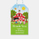 Dieses niedliche und lustige Geschenketikett zeigt ein Schwarz-Haar-Mädchen mit feiner Haut neben einer roten Scheune mit einem Hahn-Wind. Es gibt bezaubernde Nutztiere wie Kuh, Schwein und Henne. Im Hintergrund ist ein hellblauer Himmel, Apfelbäume, Sonnenschein, Schmetterlinge und Gänseblumen. Der Text kombiniert fett und serifenlose Schriftart für ein stilvolles und modernes Aussehen. Das ist perfekt für eine Geburtstagsfeier zum Thema Farm.
