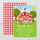 Diese niedliche und lustige Dankeschön-Karte zeigt ein rotes Haar-Mädchen mit feiner Haut neben einer roten Scheune mit einem Hahn-Wind-Vane. Es gibt bezaubernde Nutztiere wie Kuh, Schwein und Henne. Im Hintergrund ist ein hellblauer Himmel, Apfelbäume, Sonnenschein, Schmetterlinge und Gänseblumen. Der Text kombiniert fett und serifenlose Schriftart für ein stilvolles und modernes Aussehen. Das ist perfekt für eine Geburtstagsfeier zum Thema Farm.