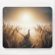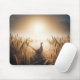 Ein Fasan steht inmitten eines Weizenfeldes, wobei die Sonne im Hintergrund aufgeht und ein goldenes Licht ausstrahlt und eine ätherische, nebensächliche Atmosphäre schafft.