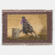 Ein Cowgirl läuft um die Fässer in einem Rodeo. Der Blick der bearbeiteten ledernen Einfassung es.