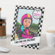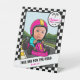 Wrap up the celebration in full-speed style with this Fast ONE Favor Table pedestal sign! Featuring your child’s face driving a race car across the checkered finish line, a bold black and white checkered border, racetrack background, and twin race flags in a custom round label with the “Fast” (in pink) and “ONE” (in checkered) lettering—this sign is the perfect finishing touch for your party favor station.