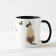 Eine Siamkatze starrt einen orangefarbenen Monarchschmetterling an, während sie auf dieser niedlichen Kaffeekaffe vorbeiflimmert. Das Bild ist beidseitig bedruckt, der schwarze Text in der Mitte steht "Lass LIFE INTRIGUE you". Ihr Name ist im Skript am Ende. Der gesamte Text kann angepasst werden, sodass Sie ihn auf alles ändern können, was Sie bevorzugen.
