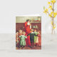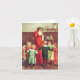 Lovely nostalgic vintage illustration of Papa Noël, or Father Christmas, blowing a horn while cute little children are cheerfully dancing hand in hand in a circle around him.