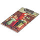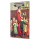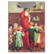 Lovely nostalgic vintage illustration of Papa Noël, or Father Christmas, blowing a horn while cute little children are cheerfully dancing hand in hand in a circle around him.