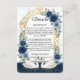 Set the tone for an enchanted evening with this elegant reception detail insert. Featuring romantic swans and deep navy florals for a sophisticated fairytale.This design features a sophisticated composition beginning with a printed white marble background texture overlaid with an ornate, faux gold foil filigree arch. The upper frame is adorned with watercolor roses in shades of navy, slate, and dusty blue, accented by sage green eucalyptus leaves. At the base, a pair of white swans floats on a digital illustration of water, reflecting a celestial night sky sprinkled with printed gold glitter dust. The typography blends an elegant calligraphy script header with traditional serif body text in a formal layout. This is a flat printed image with a faux gold foil and glitter effect; it does not contain actual raised metal, foil, or glitter.
