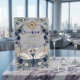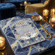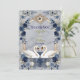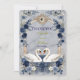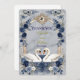 Express your gratitude with the timeless romance of Swan Lake. This design captures the magic of a fairytale wedding with elegant navy hues and lush florals.This design features a digital watercolor illustration of two graceful white swans forming a subtle heart shape, set against a printed white marble texture background. The scene is framed by an ornate, faux gold baroque archway intertwined with lush greenery, dusty blue roses, and deep navy accents. The typography pairs a sweeping, traditional calligraphy script with a clean serif font for a sophisticated finish. This is a flat printed image with a faux gold foil and marble texture effect, not actual raised foil or stone material.