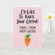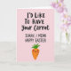 This card features a soft pastel pink background with a cheeky Easter message centered near the top, mixing large, flowing lettering with smaller, neat print beneath it. The main line reads “I’D LIKE TO HAVE Your Carrot” in dark text, and just below it “SORRY, I MEAN HAPPY EASTER” appears in a simpler style, also in dark lettering, like a quick, flustered correction. Under the words, a bright orange carrot character stands alone, adding a sweet, flirty tone as if it’s offering a shy grin to someone special 🐰. Its leafy top is a fresh green, and the face is minimal with two tiny black eyes, a curved smile, and a soft blush on the cheeks that suggests a tender, friendly crush. Fine horizontal lines across the carrot give it a natural texture without cluttering the design. The spacing leaves plenty of open pink around the text and character, keeping the focus on the playful wordplay and the bashful expression 🌷. The carrot sits beneath the centered text, with its green leaves pointing upward against the pink background.