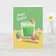 This card features a springtime egg-dyeing scene with a clear glass filled with rich emerald-green liquid at the center. A round little yellow chick with orange wings balances on the rim, leaning in as if sharing a friendly moment with the viewer 🐣🌷. Around the base sit several decorated eggs, arranged close together like they’re keeping each other company. One egg is bright blue with scattered pink and orange dots, another is creamy with pink stars and stripes, and another is deep magenta with neat white polka dots. A green egg nearby has fine white leafy lines that echo a garden pattern, tying the colors together. In the foreground, a slim paintbrush rests on a sunny yellow surface dotted with small white spots, suggesting the next egg is about to be painted 🐰. Behind everything, a light green background holds large white text near the top as a simple Easter greeting.