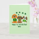 This greeting card shows three puppy friends standing close together on a pale lime-green background that feels like early spring, with a sweet, affectionate closeness in the way their big eyes seem to meet. Each pup wears green glasses and festive clothing: one in a ribbed green sweater, one in a shamrock bandana, and one in a green-and-white striped sweater, each featuring a little clover detail 💚. Darker green shamrocks drift above their heads like confetti, adding extra St. Patrick’s Day charm ☘️. The orange pup has a tiny tongue peeking out, giving the group a teasing, friendly energy, while the others look on with soft, welcoming expressions. The message “Happy St. Patrick’s Day! Wife,” appears in rounded, bubbly green lettering along the lower portion of the design, standing out clearly against the light background. The characters are centered as a tight trio, with the shamrocks spaced around them so the scene feels airy rather than crowded. Small clover icons repeat on the outfits and echo the floating shamrocks above, all in shades of green against the pale lime field.