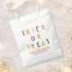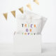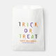 Trick oder behandeln bunt leckere Typografie Halloween lustige personalisierte Halloween-Party Gefallen Taschen. Orange, grüne, lila, weiße, farbige Typografie, schwarzer Hintergrund. Anpassbarer Text und Familienname am Boden der Tasche.